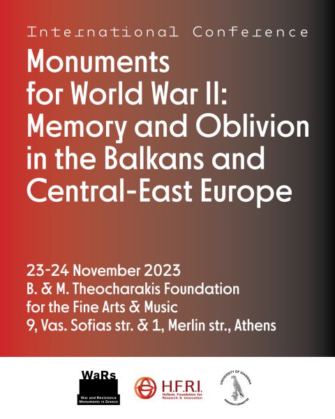 Στο πλαίσιο του Έργου WaRs: War and Resistance Monuments in Greece: Documentation of and Historical Approach to Public Monuments, 1945-today, που χρηματοδοτεί το Ελληνικό Ίδρυμα Έρευνας και Καινοτομίας (ΕΛ.ΙΔ.Ε.Κ.), διοργανώνεται στην Αθήνα στις 23-24 Νοεμβρίου το Διεθνές Συνέδριο Μνημείων του Β’ Παγκοσμίου Πολέμου στην Κεντρική και Ανατολική Ευρώπη. Στο συνέδριο θα συμμετάσχουν ειδικοί από τα Βαλκάνια που θα διερευνήσουν τη σημασία των μνημείων του Β’ Παγκοσμίου Πολέμου και τον ρόλο στη διατήρηση της μνήμης και της ιστορίας των Βαλκανίων και της Κεντρικής Ανατολικής Ευρώπης.