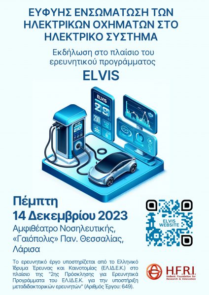 Στο πλαίσιο του ερευνητικού έργου “ELVIS” (Smart ELectric Vehicles Integration in electric energy Systems), η ομάδα του Έργου, υπό την αιγίδα του Τμήματος Συστημάτων Ενέργειας του Πανεπιστημίου Θεσσαλίας, οργανώνει την Πέμπτη 14 Δεκεμβρίου του 2023 και ώρα 13:00 στο Αμφιθέατρο της Νοσηλευτικής, στο συγκρότημα «Γαιόπολις» του Πανεπιστημίου στη Λάρισα, τεχνική ημερίδα με τίτλο «Ευφυής ενσωμάτωση των ηλεκτρικών οχημάτων στο ηλεκτρικό σύστημα», στην οποία θα συμμετέχουν διακεκριμένοι ομιλητές από το Πανεπιστήμιο Θεσσαλίας και την αγορά.