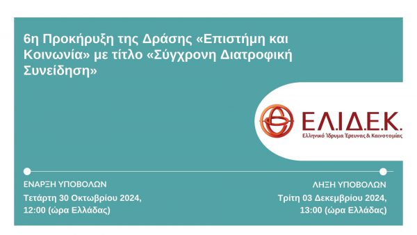 Το Ελληνικό Ίδρυμα Έρευνας και Καινοτομίας (ΕΛ.ΙΔ.Ε.Κ.), προχώρησε σήμερα, Πέμπτη 03 Οκτωβρίου 2024, στη δημοσίευση της 6ης Προκήρυξης της Δράσης «Επιστήμη και Κοινωνία» με τίτλο «Σύγχρονη Διατροφική Συνείδηση», ενισχύοντας την αποστολή του στην στήριξη της ερευνητικής προσπάθειας στην Ελλάδα, δίχως θεματικούς και γεωγραφικούς περιορισμούς.