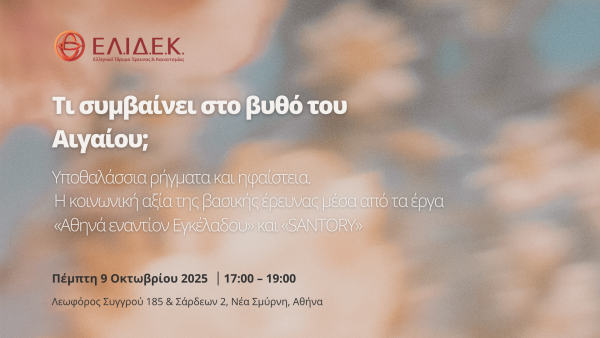 Το Ελληνικό Ίδρυμα Έρευνας και Καινοτομίας (ΕΛ.ΙΔ.Ε.Κ.) διοργανώνει την Πέμπτη 9 Οκτωβρίου 2025 και ώρα 17:00 μ.μ. την εκδήλωση με τίτλο: Τι συμβαίνει στο βυθό του Αιγαίου; Υποθαλάσσια ρήγματα και ηφαίστεια. Η κοινωνική αξία της βασικής έρευνας μέσα από τα έργα «Αθηνά εναντίον Εγκέλαδου» και «SANTORY».