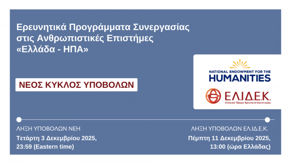 Στο πλαίσιο του Μνημονίου Συνεργασίας ανάμεσα στο Ελληνικό Ίδρυμα Έρευνας και Καινοτομίας (ΕΛ.ΙΔ.Ε.Κ.) και το National Endowment for the Humanities (NEH) των Ηνωμένων Πολιτειών της Αμερικής, ανακοινώνεται η δεύτερη περίοδος υποβολής Προτάσεων για την Προκήρυξη με τίτλο: «Ερευνητικά Προγράμματα Συνεργασίας στις Ανθρωπιστικές Επιστήμες ‘‘Ελλάδα – ΗΠΑ”».