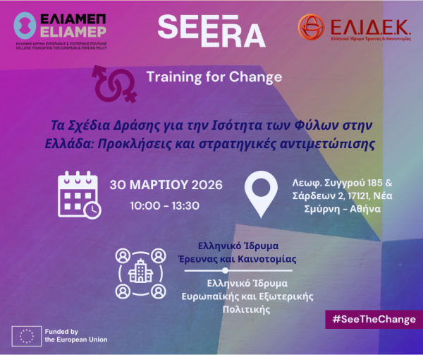 Το Ελληνικό Ίδρυμα Ευρωπαϊκής και Εξωτερικής Πολιτικής (ΕΛΙΑΜΕΠ) και το Ελληνικό Ίδρυμα Έρευνας και Καινοτομίας (ΕΛ.ΙΔ.Ε.Κ.) συνδιοργανώνουν την εκπαιδευτική ημερίδα με τίτλο: «Τα Σχέδια Δράσης για την Ισότητα των Φύλων στην Ελλάδα: Προκλήσεις και στρατηγικές αντιμετώπισης».