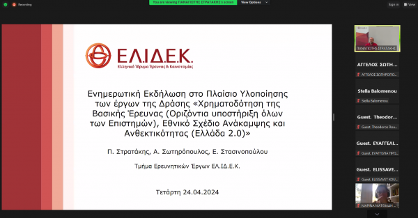On Wednesday, April 24, 2024, the Hellenic Foundation for Research and Innovation (HFRI) organized an information event within the framework of the Action “Basic Research Financing (Horizontal support for all Sciences), National Recovery and Resilience Plan (Greece 2.0).”